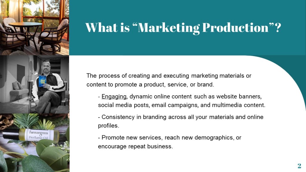 The main purpose of this presentation is to give folks a better understanding of the type of work involved in marketing production and the companies that can benefit the best from it.